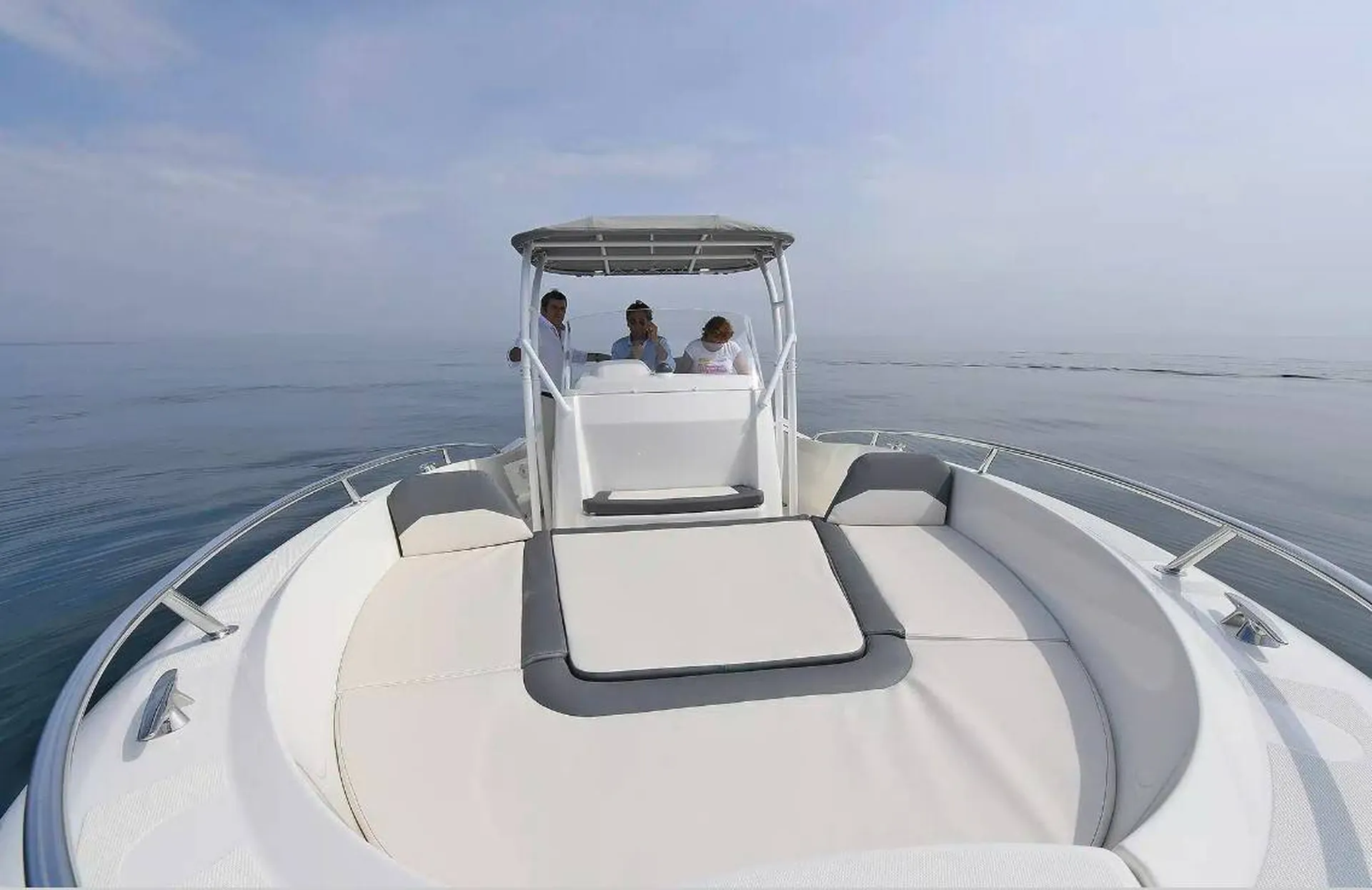 A l'arrière, le cockpit reçoit une banquette en L avec table et coffres ; à l'avant, une vaste plage de bain avec soute, modulable en un beau carré en U. Spacieuse cabine de stockage au poste de pilotage où pourra s'y loger un WC marin, le plat-bord basculant du 280 Center Console constitue une véritable terrasse sur l'eau.