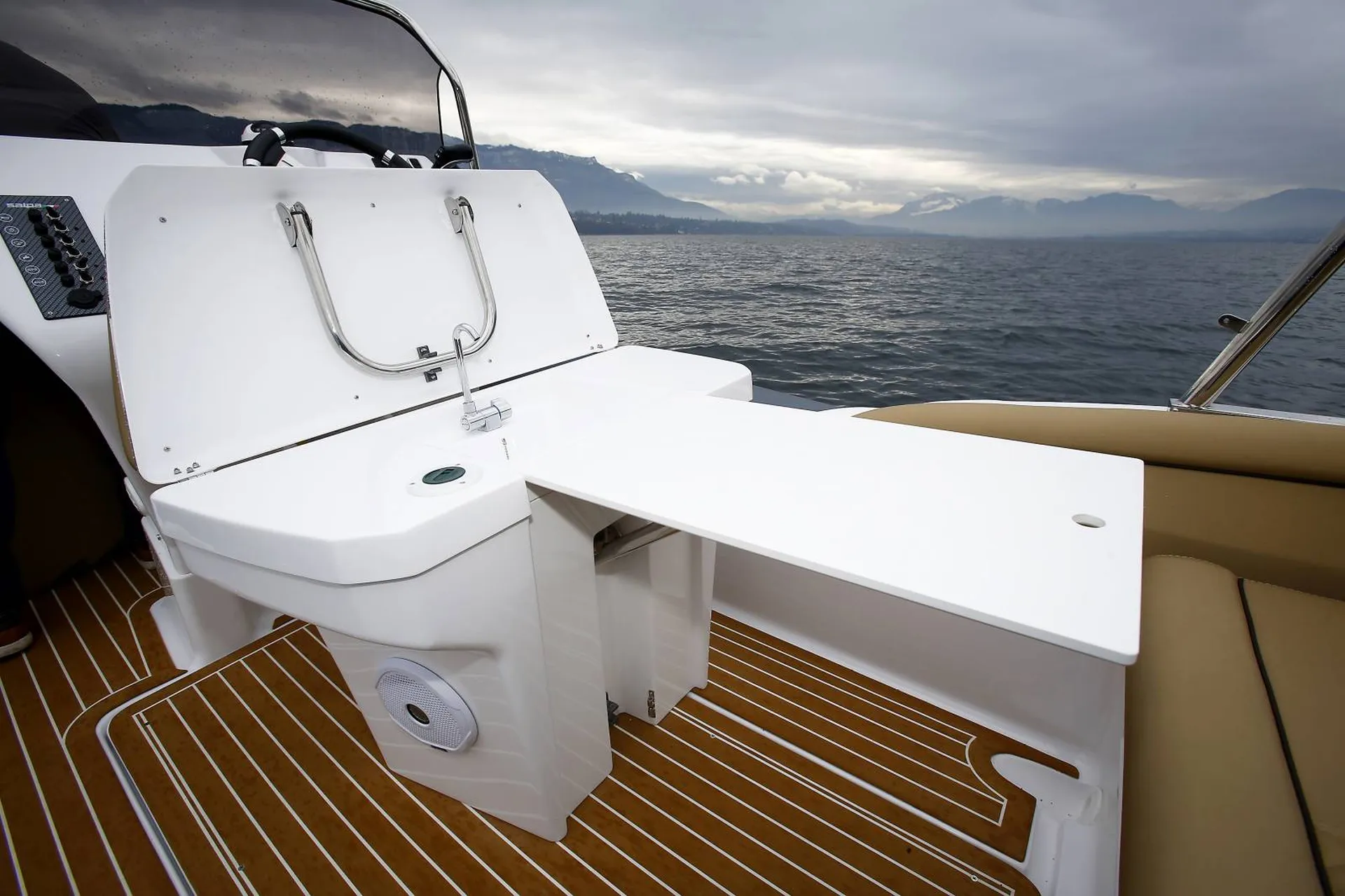 - Table et évier - Douchette de pont - Roll bar et bimini, taud de console, mat de ski, bâche d'hivernage - Guindeau électrique, radio, VHF, GPS, sondeur et direction hydraulique - Coloris des pneumatiques et de la sellerie au choix, le cockpit peut aussi être en teck.