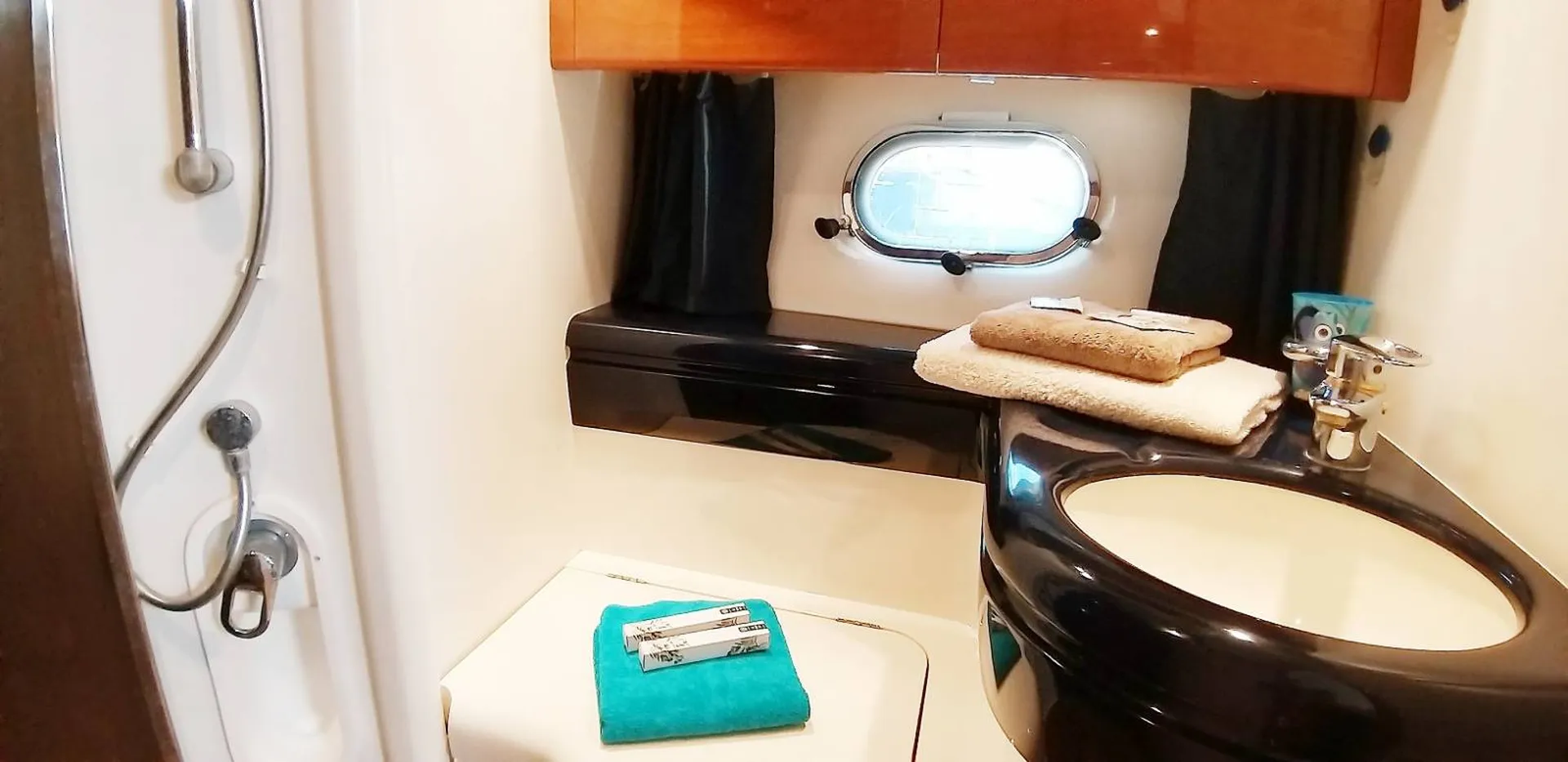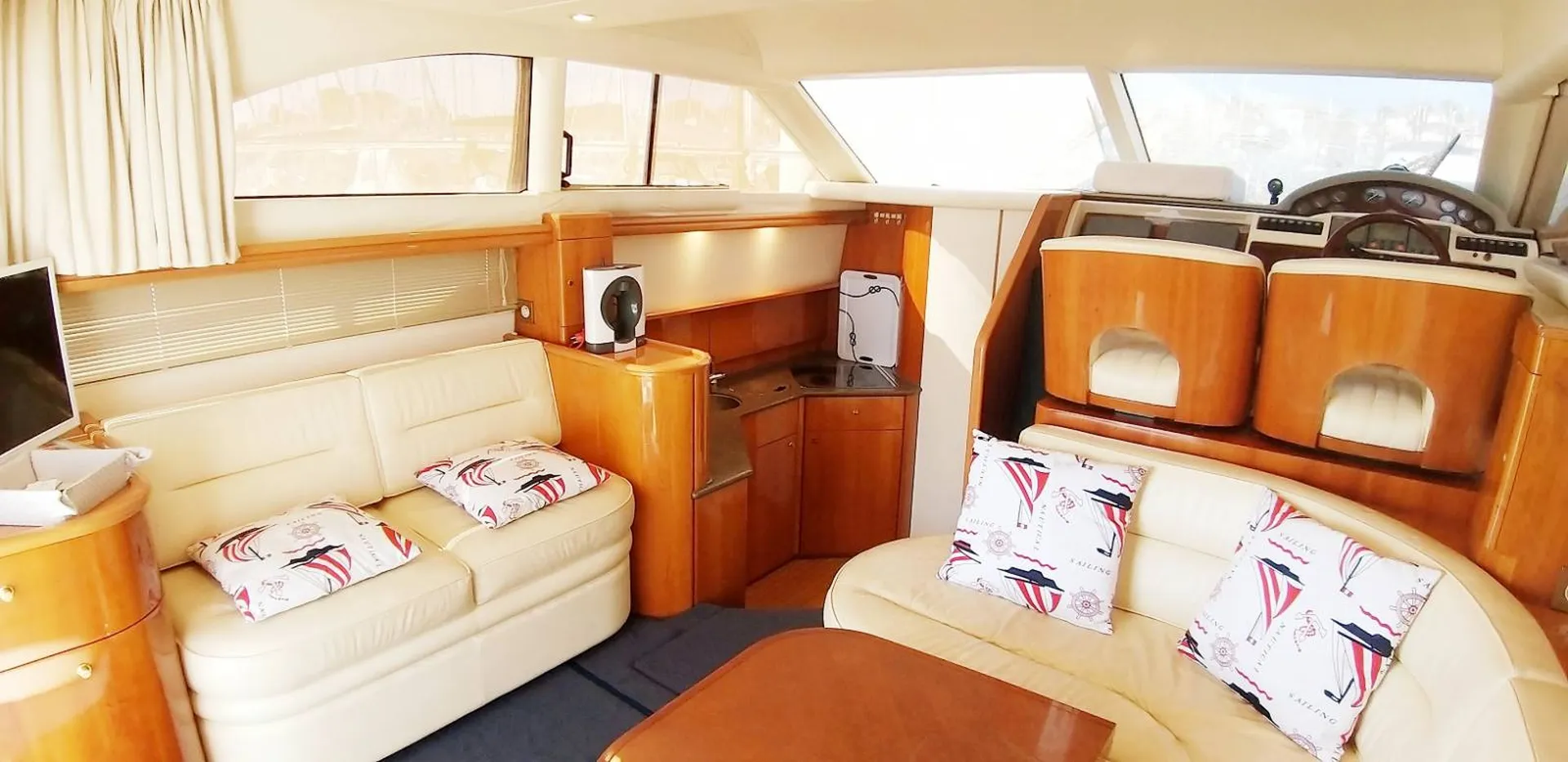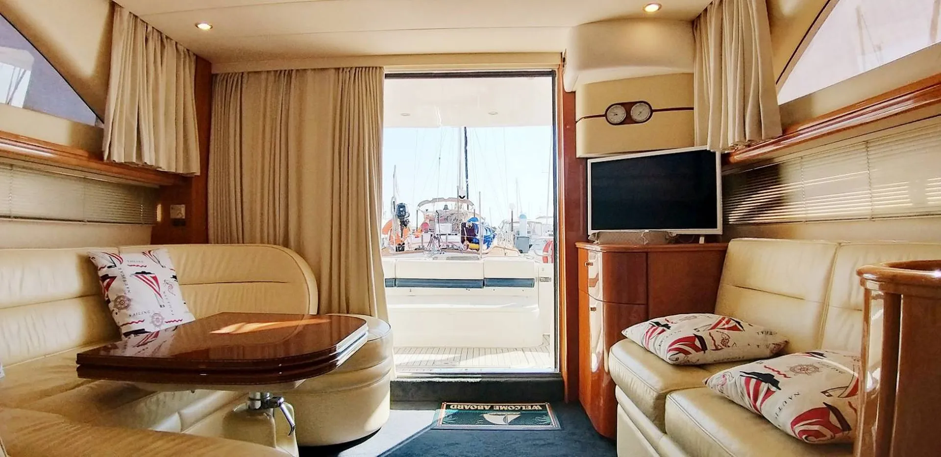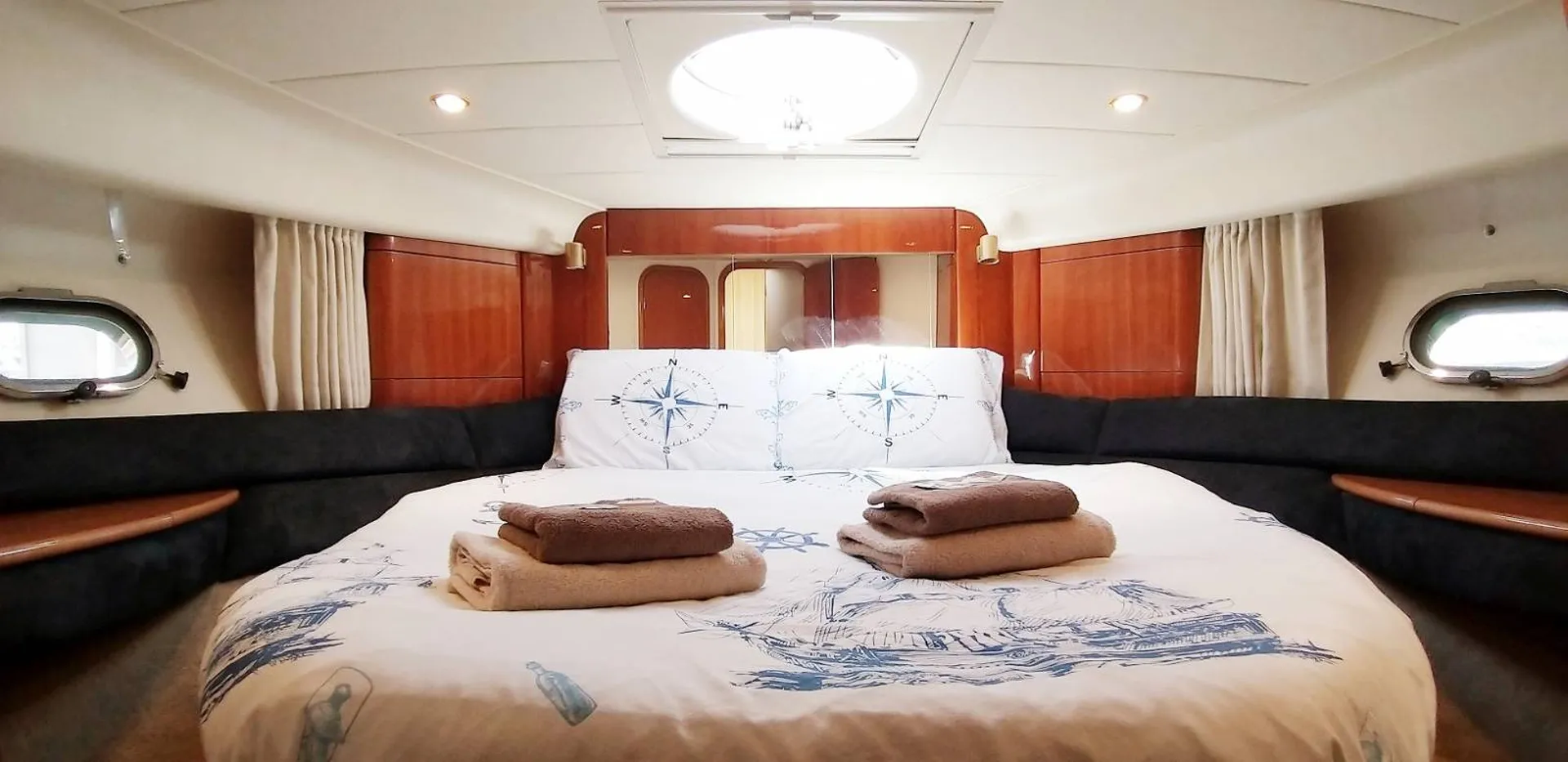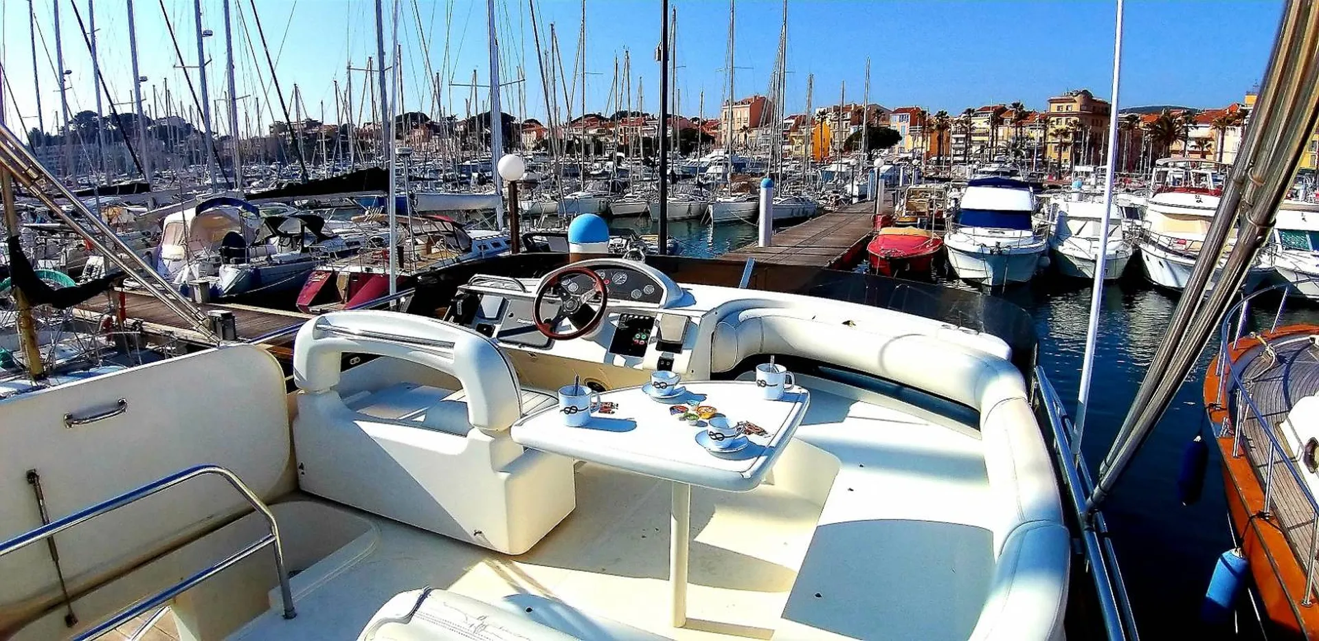 A bord de cette belle vedette flybridge vous pourrez séjourner et vous régaler en navigation , au port et en au mouillage