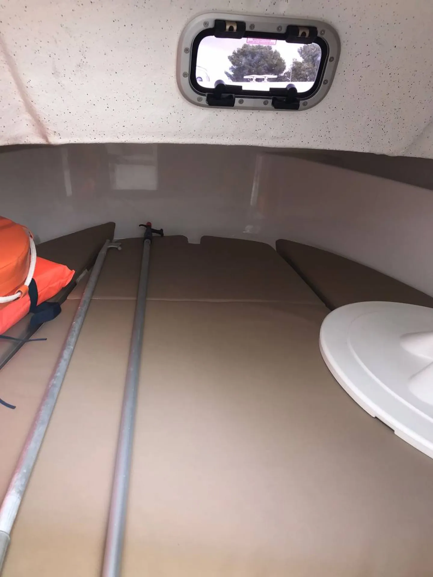 Ce bateau à moteur habitable d'occasion dispose d'une cabine 2 couchages pour une nuit à bord ou servir de rangement.