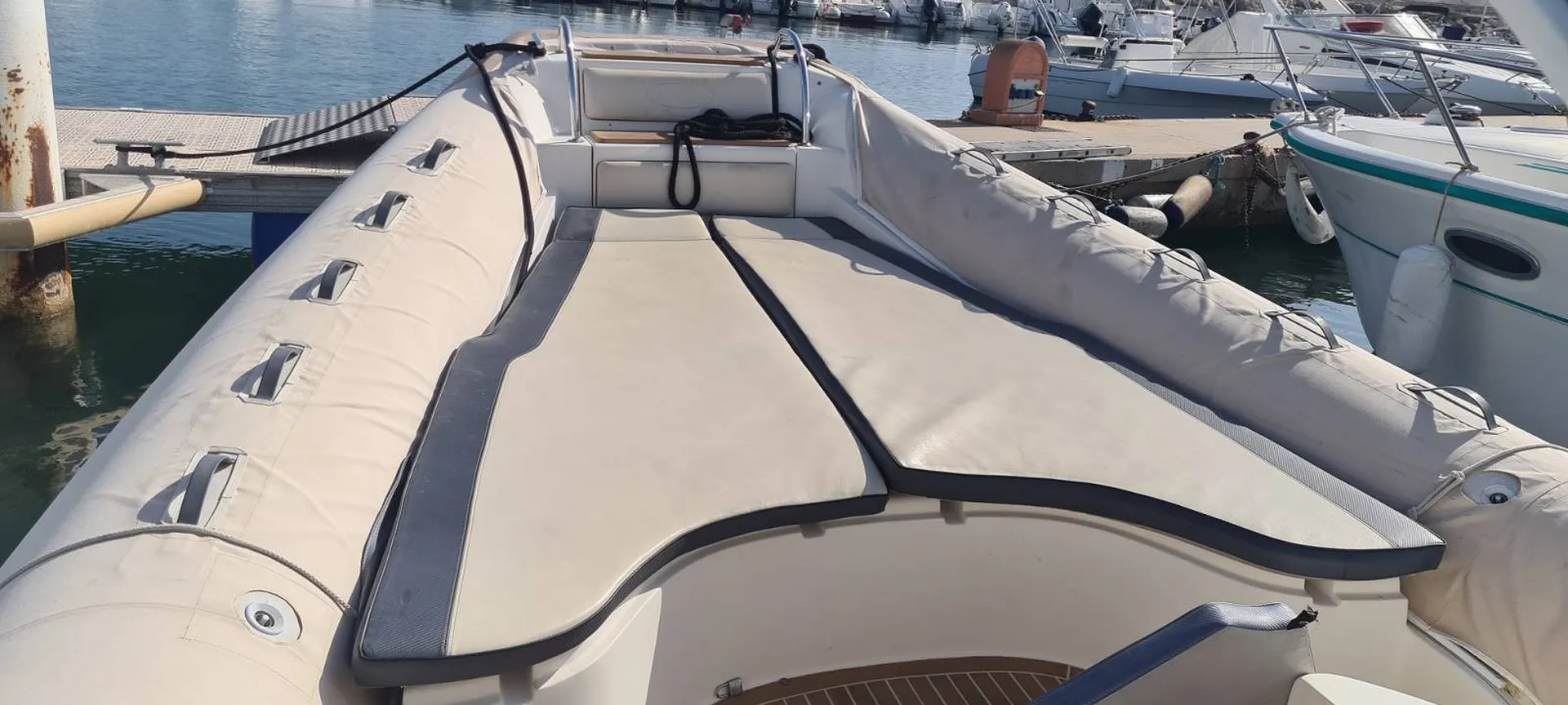 Vitesse de croisière de 20 noeuds (42 max), de type croiseur, puissant, sportif et avaleur de milles, ce semi-rigide d'occasion est très bien entretenu : sellerie récente, anti fouling, effectué et moteur révisé en 2022 (factures à l'appui).
