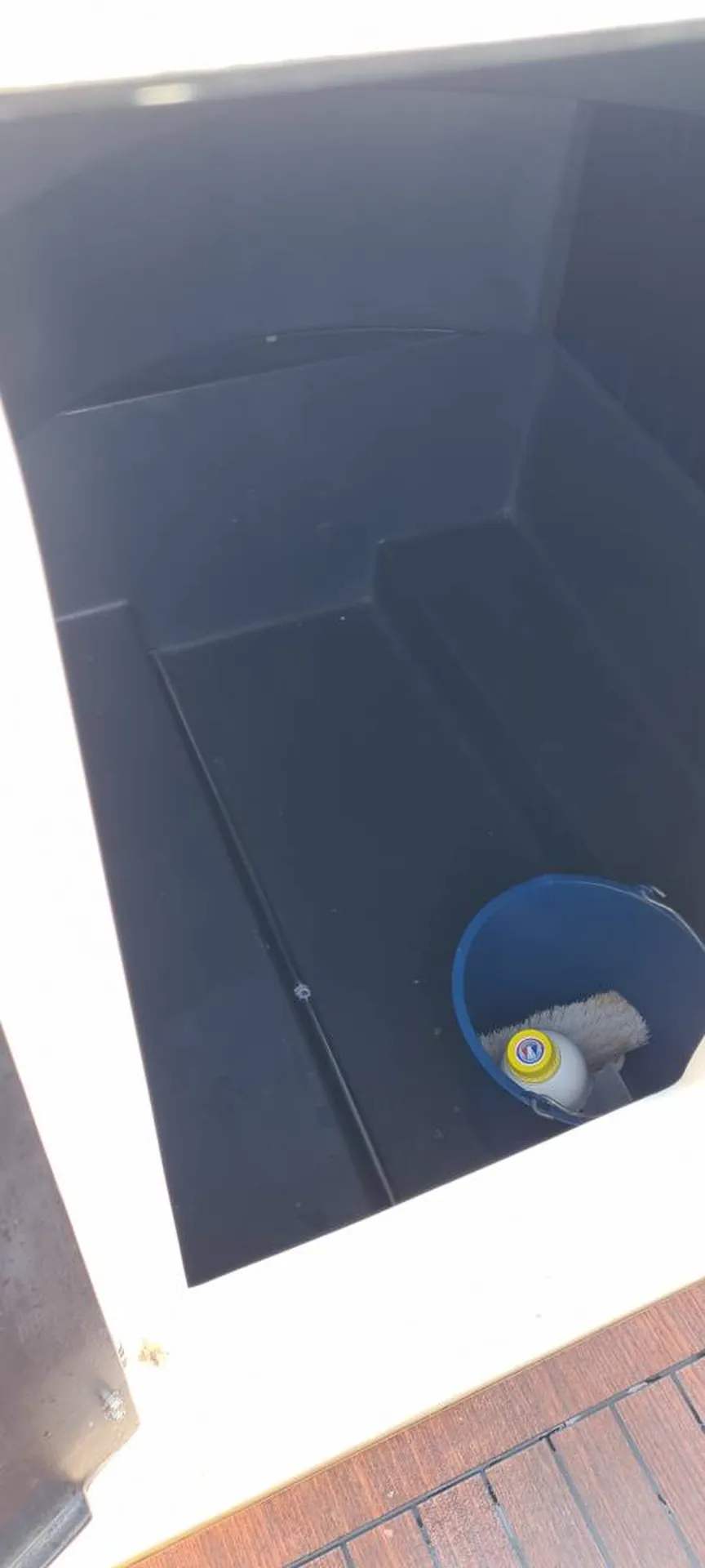 Privilégiant les grands espaces de bain de soleil, ce bateau à moteur rigide, vendu d'occasion, comprend une astucieuse table de pique-nique, qui une fois baissée, se transforme en une immense plateforme de détente et bronzage, tout comme sa banquette arrière. Idéal pour ranger ses affaires personnelles, et y placer un WC (en option), sa console abrite une petite cabine.