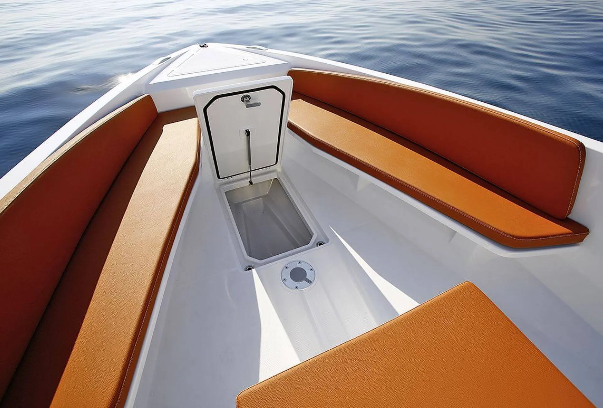 - L'avant du bateau propose un salon avec 2 fines banquettes en face à-face, une petite soute, un siège frontal de console avec réfrigérateur de 30 litres