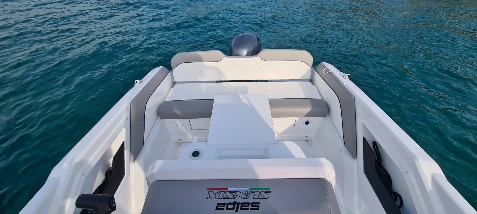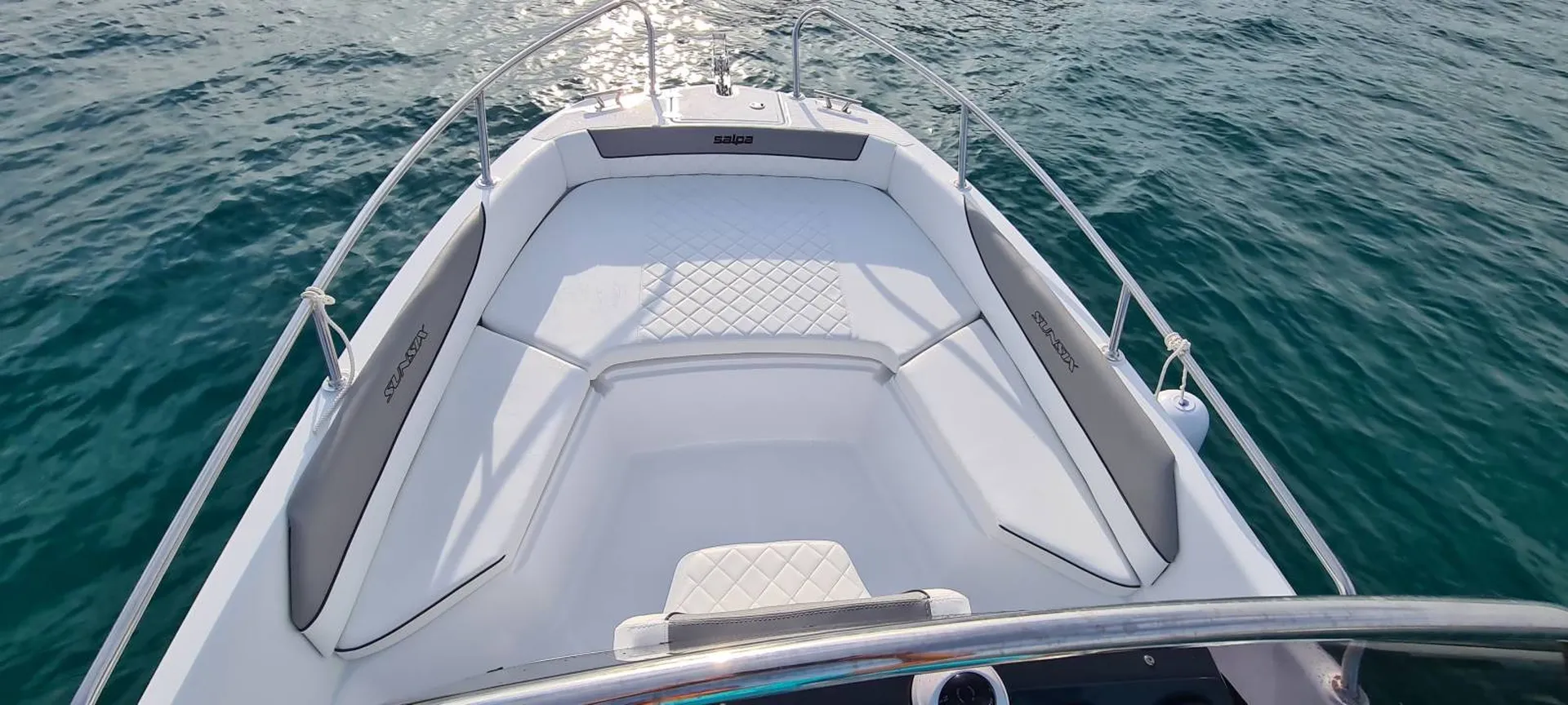 bateau Salpa Sunsix, un grand espace détente. Poches pratiques et boite à gant, d'un confort maximal avec son rembourrage tout autour du bain de soleil, son assise devant la console, est bien utile au mouillage.